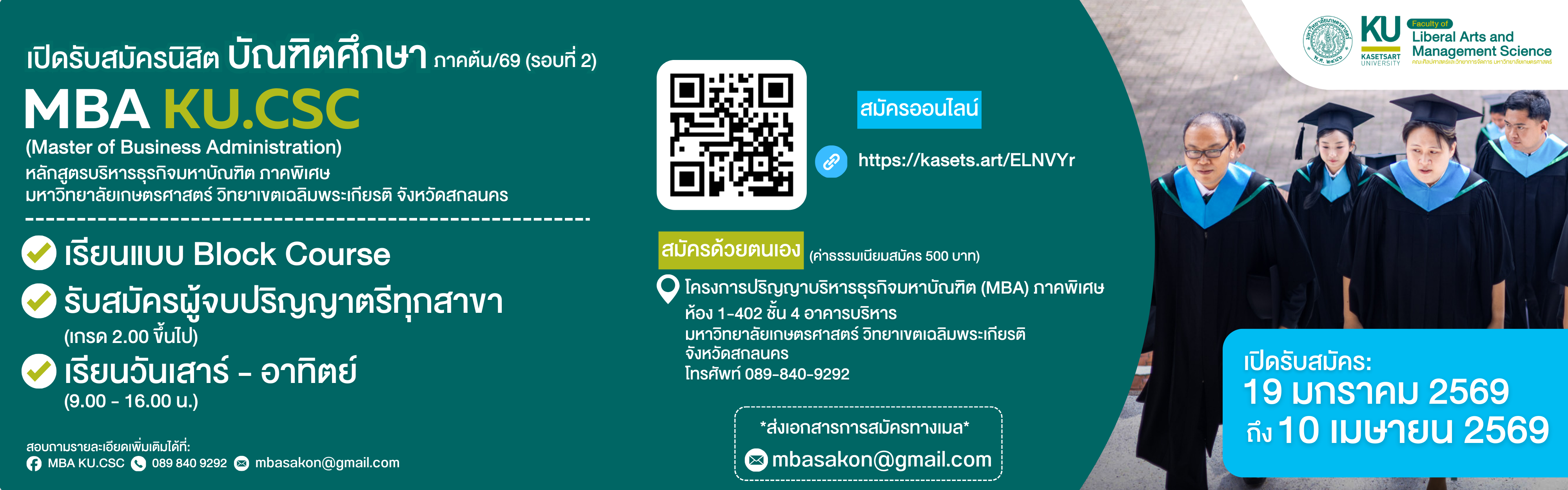 เปิดรับสมัครนิสิต ระดับปริญญาโท MBA (Master of Business Administration) หลักสูตรบริหารธุรกิจมหาบัณฑิต ภาคพิเศษ มหาวิทยาลัยเกษตรศาสตร์ วิทยาเขตเฉลิมพระเกียรติ จังหวัดสกลนคร สมัครออนไลน์ได้ที่ https://k…