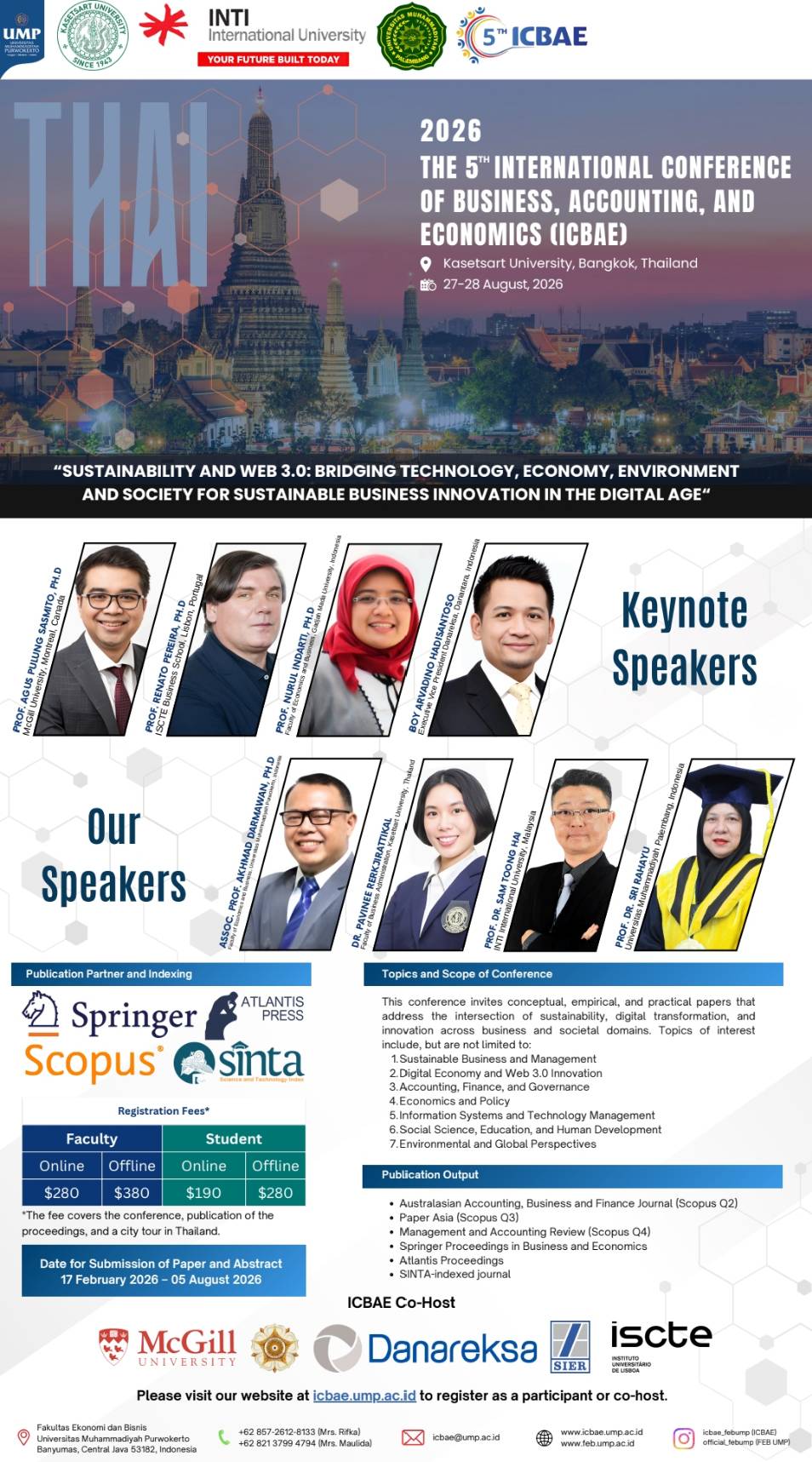 ข่าวประชาสัมพันธ์ เชิญชวนคณาจารย์และนักวิจัย ทุกท่านร่วมส่งผลงานและเข้าร่วมการประชุมวิชาการระดับนานาชาติด้านธุรกิจ การบัญชี และเศรษฐศาสตร์ 5th ICBAE2026 ภายใต้แนวคิด “Sustainability and Web 3.0: Bridging Technology, Economy, Environment and Society for Sustainable Business Innovation in the Digital Age”