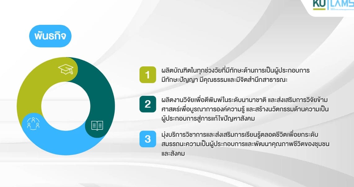 ผลิตบัณฑิตในทุกช่วงวัยที่มีทักษะด้านการเป็นผู้ประกอบการมีทักษะปัญญา มีคุณธรรมและมีจิตสำนึกสาธารณะ